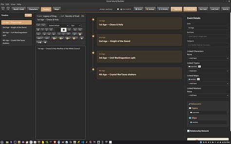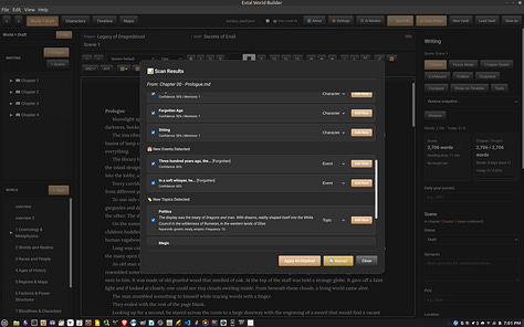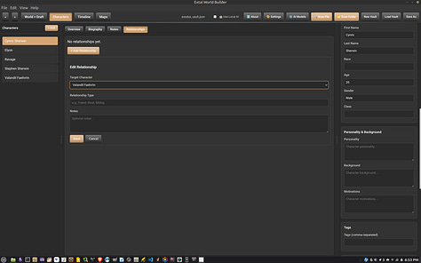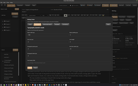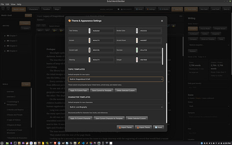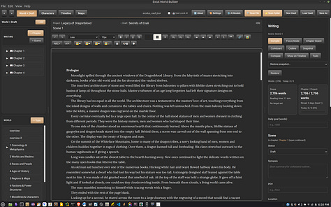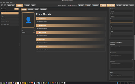 Update: The Extal Worldbuilder 0.8.0a is a quick hotfix for the writing and topics editor. For Topic paragraph lines not to keep moving, use the table function. The topics editor was built specifically to use tables so you can design an interesting page like you have in games. For the writing section, the left panel’s menu list can be dragged and dropped like the topics menu below it. I have started to move my story into the app to see how well it can hold up. The story itself is fairly long so we’ll see how this goes. On Windows, the AI Engine is working so both the Linux and Windows version is identical in function.